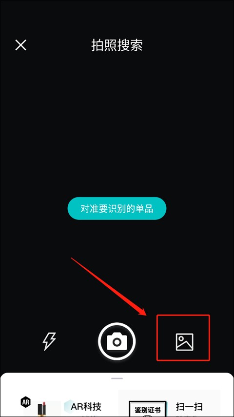2、进入拍照页面后,在页面的右下方有一个【相册】,可以选择好已经拍好的商品图片,选好后点击确定,等待3秒即可识别出商品推送;