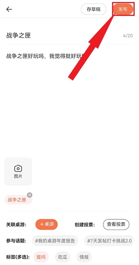 在发布之前,用户还可以点击右下角的“投票”,新建一个投票主题,让广大桌游朋友一起参与投票。