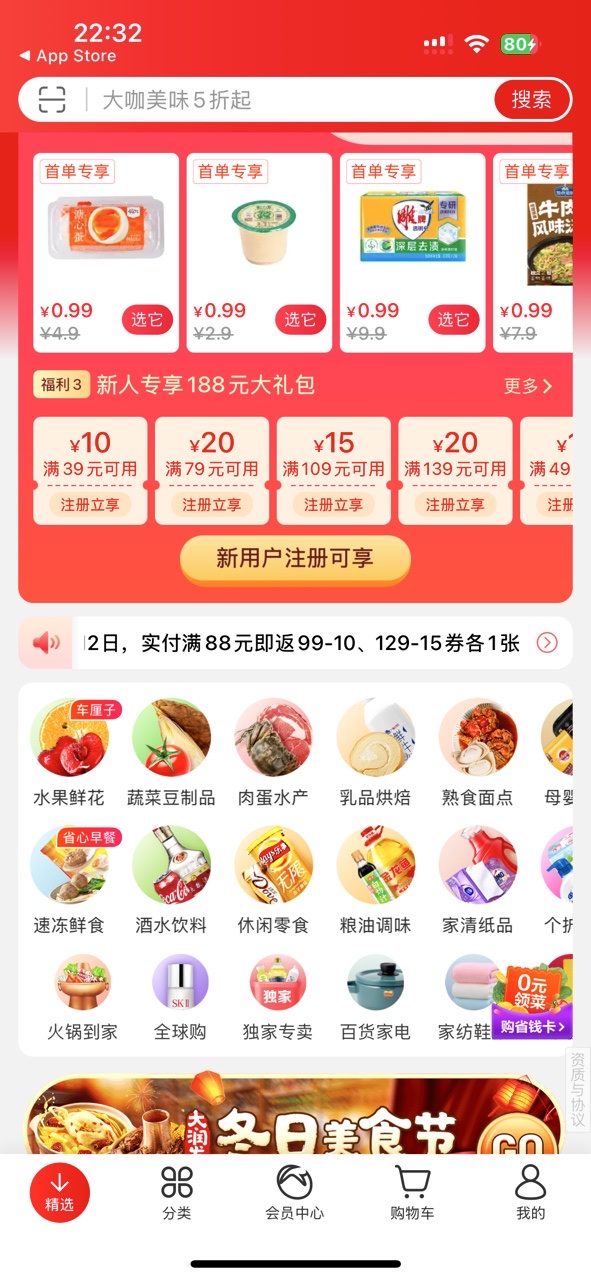 v2.1.9大润发优鲜超市是由大润发官方推出的一款超市购物配送软件,软件包含了精选生鲜、进口、百杂、快消等品类优质商品,并提供由专业大厨现制的烘焙、熟食、面点及百种自主研发推陈出新的独家美食,致力于为用户带来一站式的超市购物配送服务。
