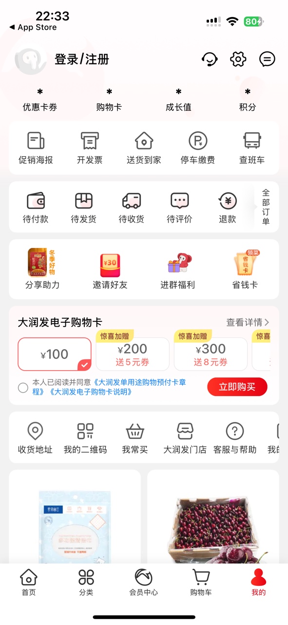 1、进入app点击右下角【我的】,进入到我的页面,之后在右下角找到【大润发门店】。
