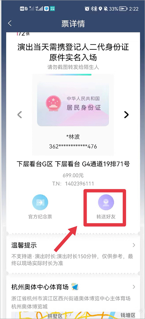 3、然后选择你要转送的票以及接受人信息后点击转送好友;