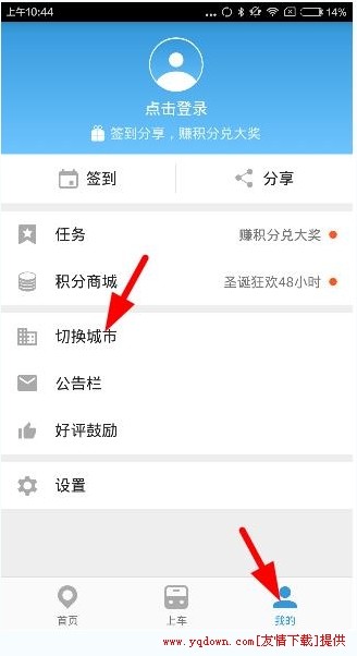 1、打开软件后,首先进入“我的”,然后点击“切换城市”,如下图: