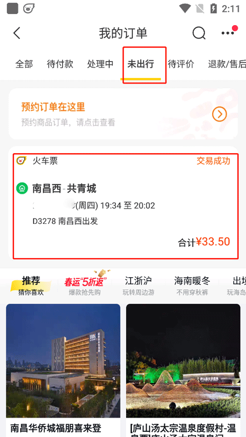 3、在软件里面进行酒店的预定和旅行景点的门票的购买,买车票也必不可少的功能。