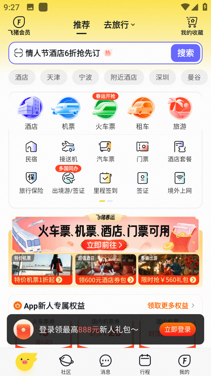 1、使用淘宝账号登录飞猪app激活飞猪出行大礼包。