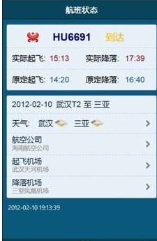 4、进出港动态可以查询某一航班的当前状态,对于去机场接人的朋友很有用处,可以及时了解晚点或者因各种原因取消航班的情况。进出港动态通过航班号或者起降地两个条件查询,而在查询结果排序上,则可以按时间或航空公司两个条件排序。