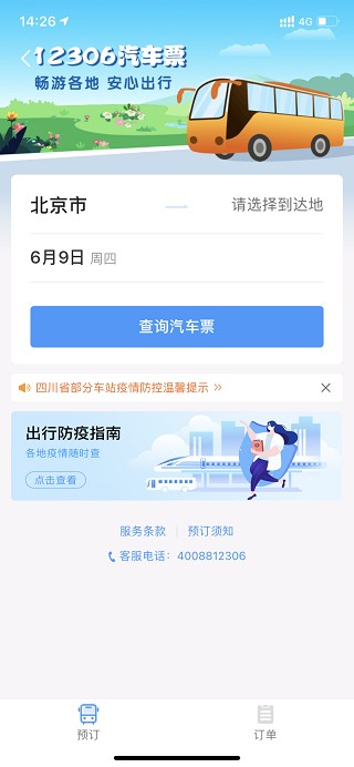 2、在汽车票预订页,输入“出发地”和“到达地”,选择“出发日期”,查询购票。