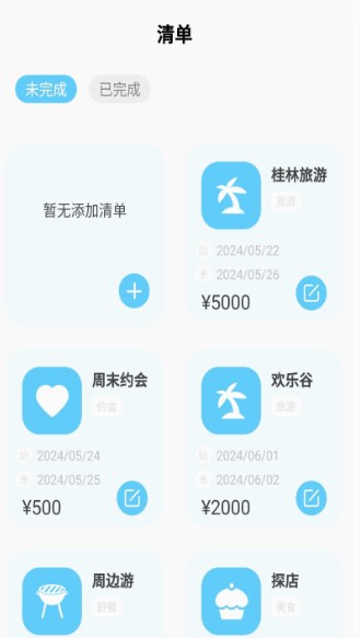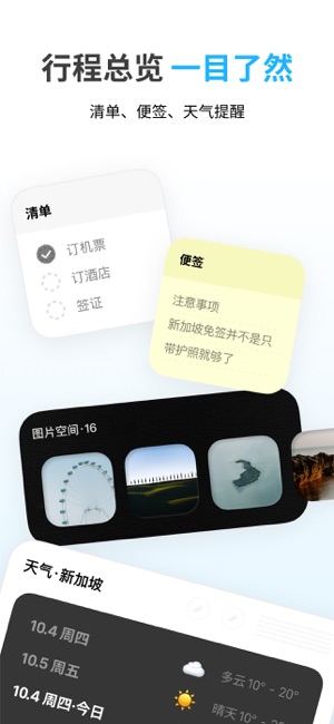 2、旅行清单记录,支持十几种记录图标输入,详细记录时间、预算以及备忘物品等,让你安心出发不怕遗漏