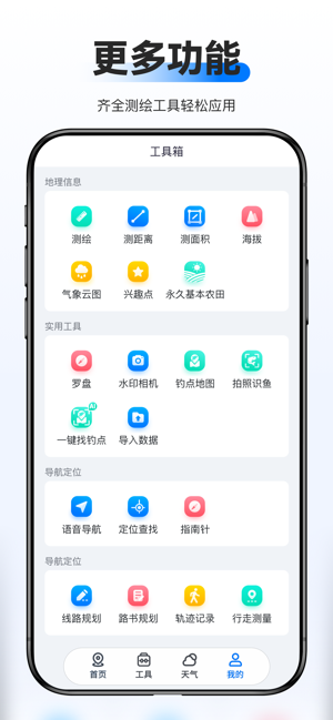 3、强大的地图标注和点线面计算功能,还包括了GPS轨迹、海拔查询、罗盘、方位图、离线地图、指南针、水平仪等实用小工具;