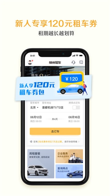 神州租车app为大家带来一款靠谱的租车平台,海量优质车源,多款车辆让用户能够进行选择,全国2000+网点,不限里程,7*24小时客服服务,让用户能够体验到极佳的租车感受。感兴趣的用户可以下载体验一下。