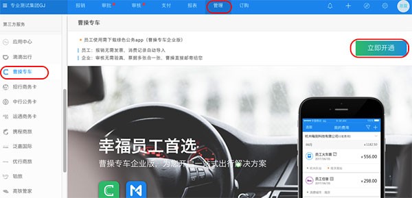 1、第三方服务的管理员,在“管理-第三方服务-曹操专车”页面