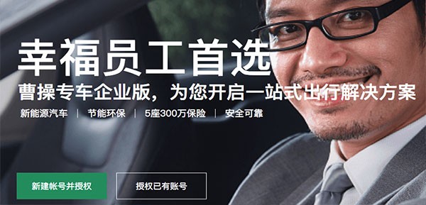2、点击“立即开通”。从未使用过曹操专车企业版的选择“新建账号并授权”;已与曹操专车线下签约的企业选择“授权已有账号”