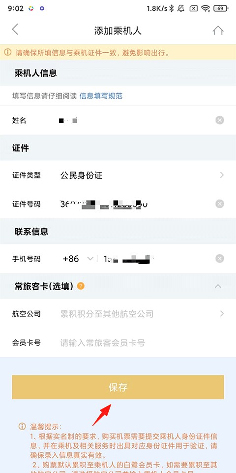 5、输入乘机人信息后点击【保存】,返回上一个页面勾选该乘机人并点击右下角确定即可完成添加同行人。