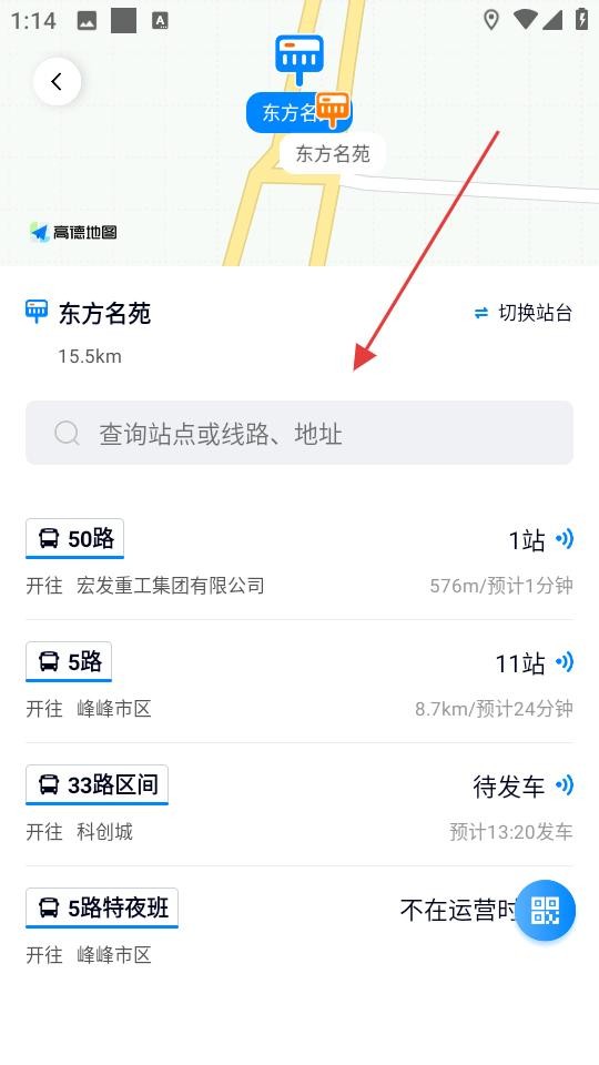 2、在搜索结果页,查看站点对应的公交线路,选择想乘坐的线路,如50路,点击进入线路详情页面。