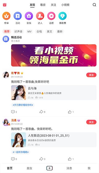 用户在登录之后会进入首页,在首页可以查看别人唱歌的内容,进入歌房一起唱歌,观看小视频。