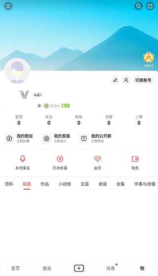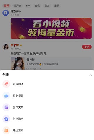 用户点击下方加号,可以进行歌曲、小视频、文章、歌房、直播的创建录制。