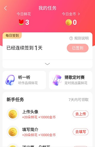 用户在首页点击左上角的金币红包,即可进入任务界面,完成即可获得大量的鲜花和金币奖励。