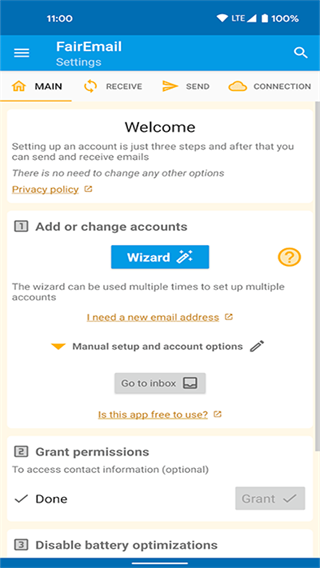 4、登录成功后,根据首页提示完成授权流程,即可开始使用FairEmail管理您的Gmail邮箱。