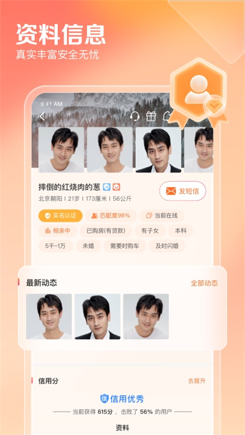 如果你担心在网上遇到骗子,相亲用户经过实名认证,资料完成度全网最高。在这里只和真实的人谈恋爱。