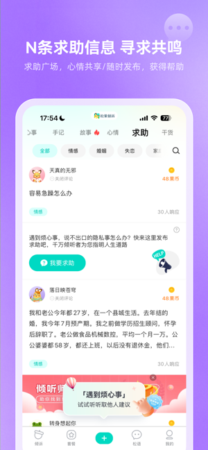 5、【温馨社区】除1对1私密倾诉外,还有求助广场、心情分享、公开课、群组分享、视频课堂、各种福利活动。