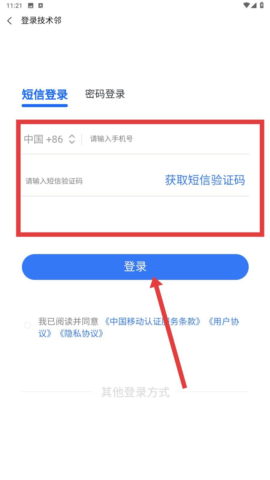 3、在登录技术邻页面,选择短信登录方式,在输入栏填写手机号码,点击获取短信验证码按钮,待收到验证码后填入,点击登录按钮,完成登录流程。