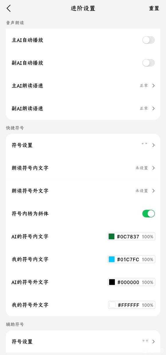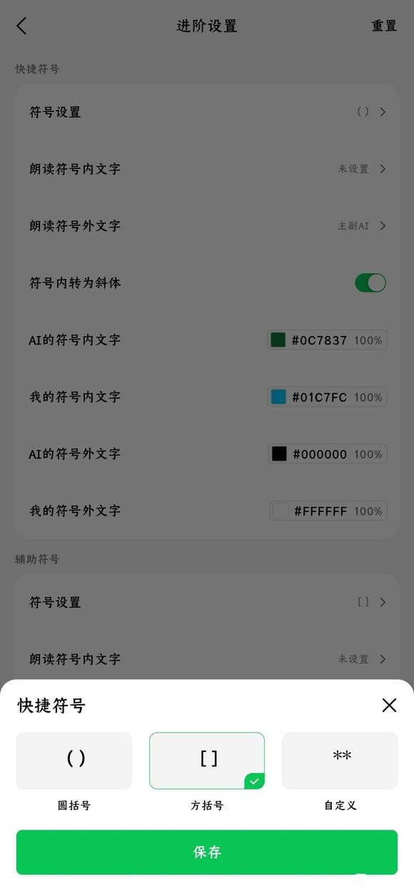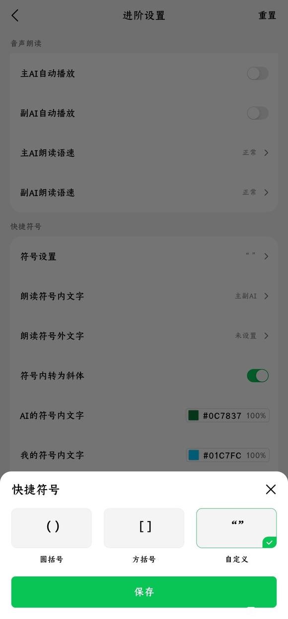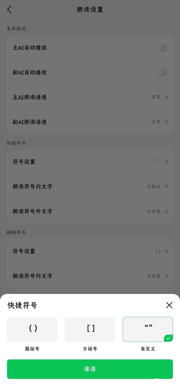 Ps:图里设定的是全文朗读,如果要设置成仅读“”内的对话,把朗读符号内文字设置成需要它朗读的AI就行。