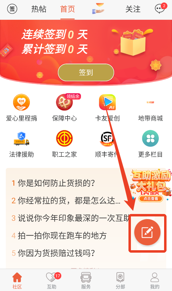 1、我们来到【社区】板块,点击右下方的橙底白笔的按钮。