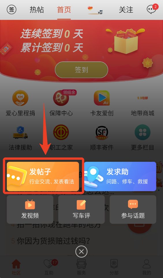 2、选择【发帖子】,你也可以发求助、发视频、写车评或者参与话题。