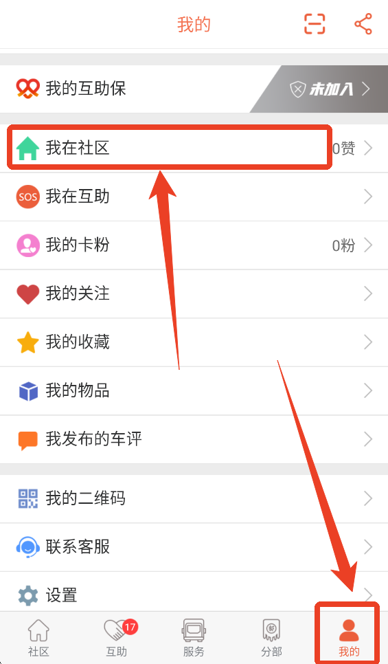 5、如果你想找自己发过的帖子,来到【我的】界面,下滑找到【我在社区】。