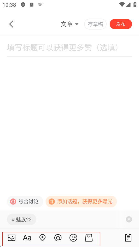 3、在屏幕的最下方拥有许多的功能,比如上传相片,字体的调整,地点的添加等等功能。