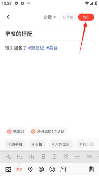 6、编辑好内容后,点击屏幕右上角的“发布”。