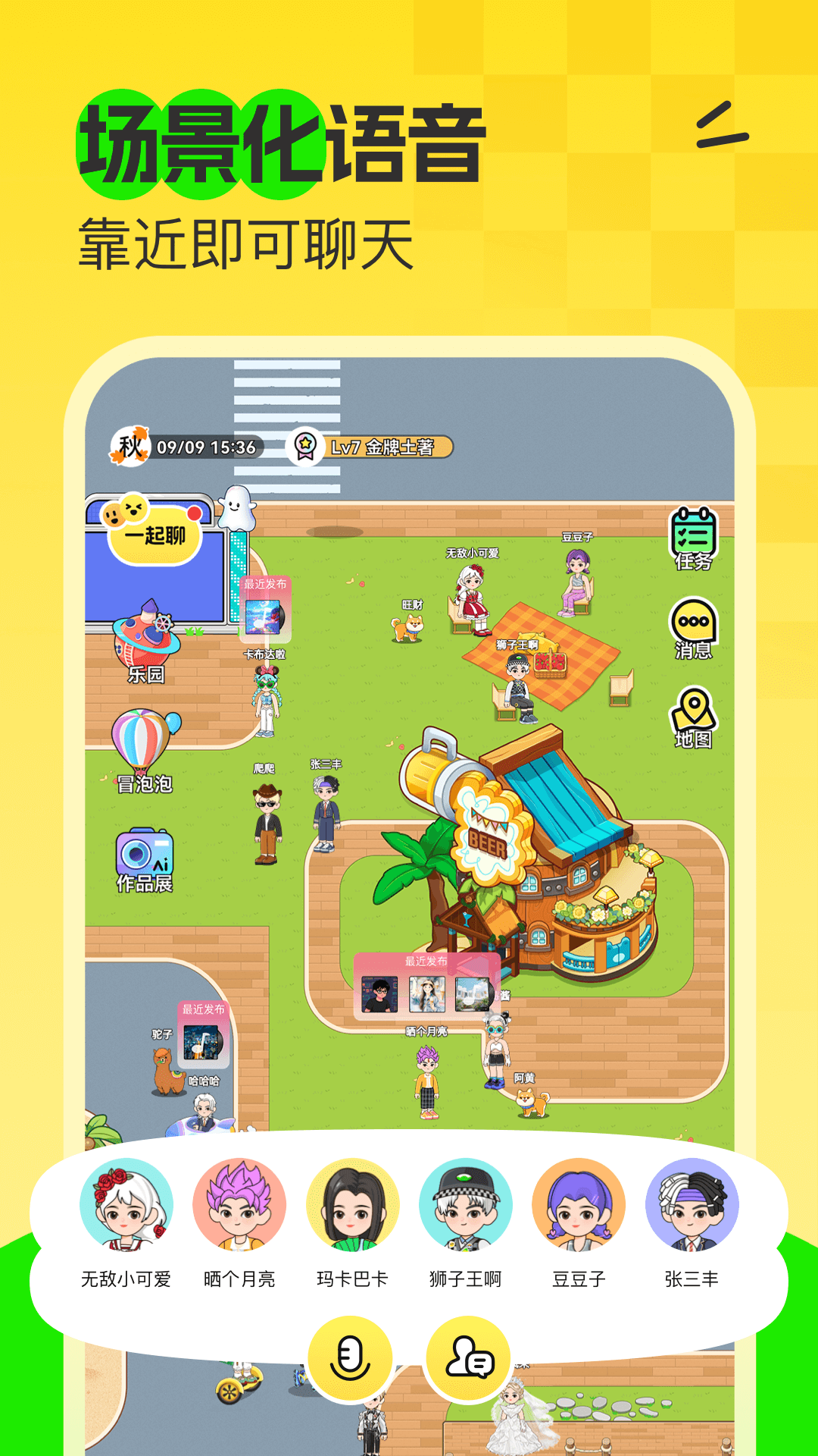换装增添趣味,个性贴纸拉近距离,靠近即可开启语音聊天。