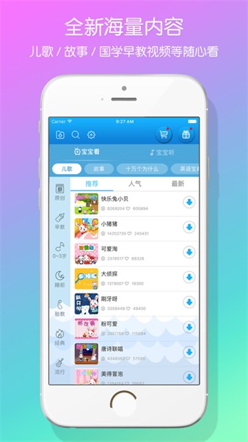 兔小贝儿歌app具备全国著名原画设计师,儿童早教心理学家打造的最贴心符合儿童的兔小贝视频动画软件,以可爱小兔子为形象,将海量儿歌,故事,古诗融入于生动有趣的原创动画中,并同时置入有一定的启蒙益智场景,是千万家长使用后一致推崇的手机必备应用。