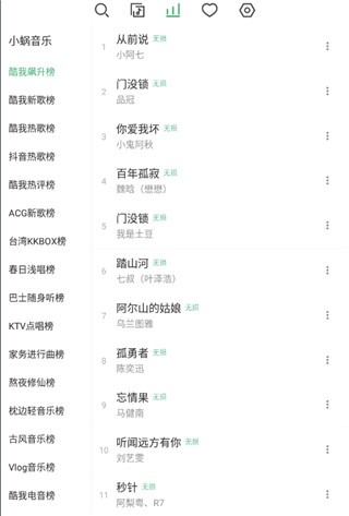 3、支持趋势榜、怀旧榜、华语榜、欧美榜、韩语榜、日语榜;