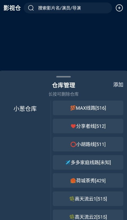 1、进入影视仓软件后,点击上方的+号,然后再点击添加,如图: