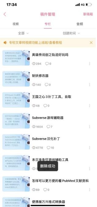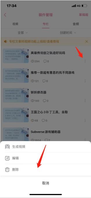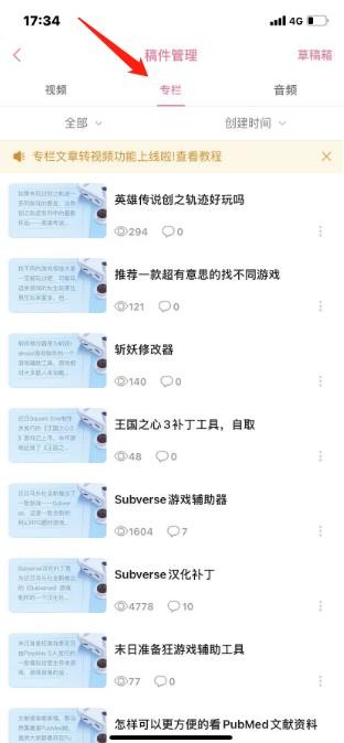 3、在稿件管理中选择你要删除的视频或者专栏、音频;