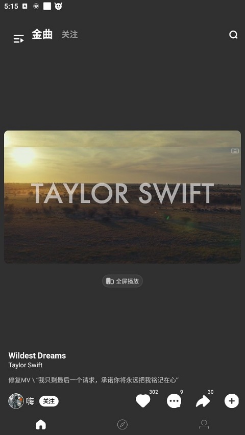 1、进入“音悦台”app,找到你点播的歌曲,如图所示,点开“全屏播放”。