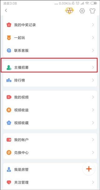2、点击屏幕左上方的头像进入登陆个人中心页面,找到菜单栏拉中的主播招募,并点进去。