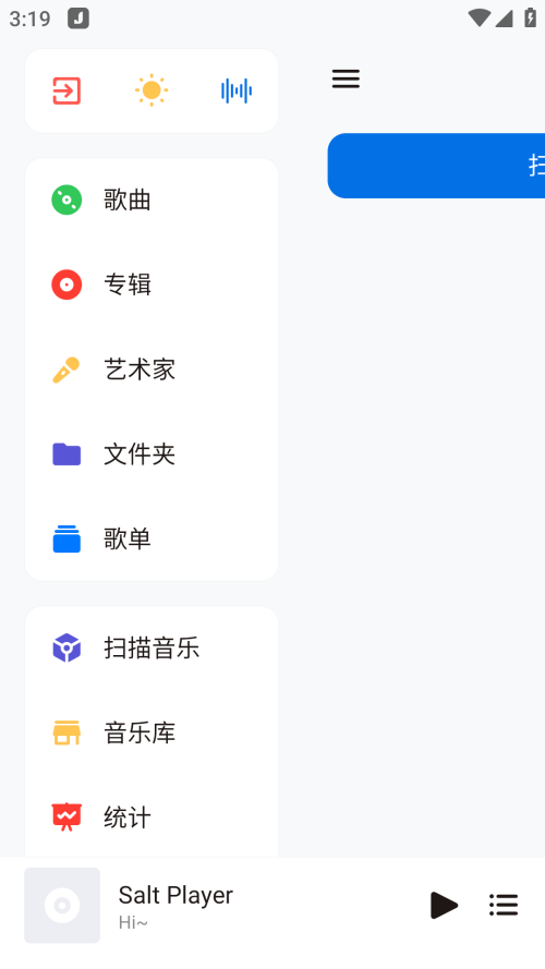 Salt Player APP是个纯粹的音乐播放器,打开后无任何音乐资源,所以需要自行下载音乐资源后再导入使用。