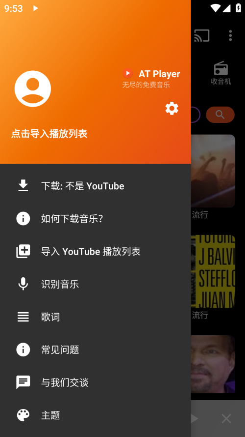 5、收听公开播放列表或从YouTube导入您的播放列表。