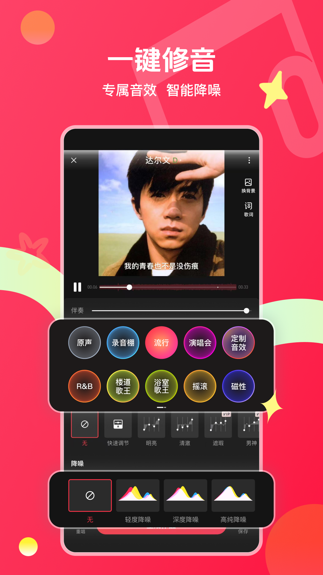 - 海量歌曲都能唱,强大的音效、一键修音功能,给你录音棚般极 致K歌享受!