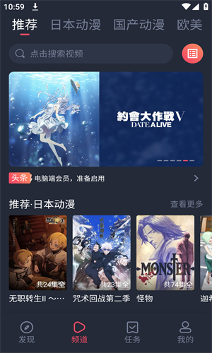 1、频道界面拥有诸多动漫资源,最上一栏可自由选择种类;