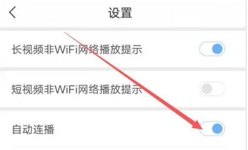 4、在弹出的“设置”窗口当中,找到并激活【自动连播】功能项完成。