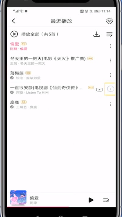 2、找到你想要设置成来电铃声的歌曲,点击歌曲旁的菜单栏