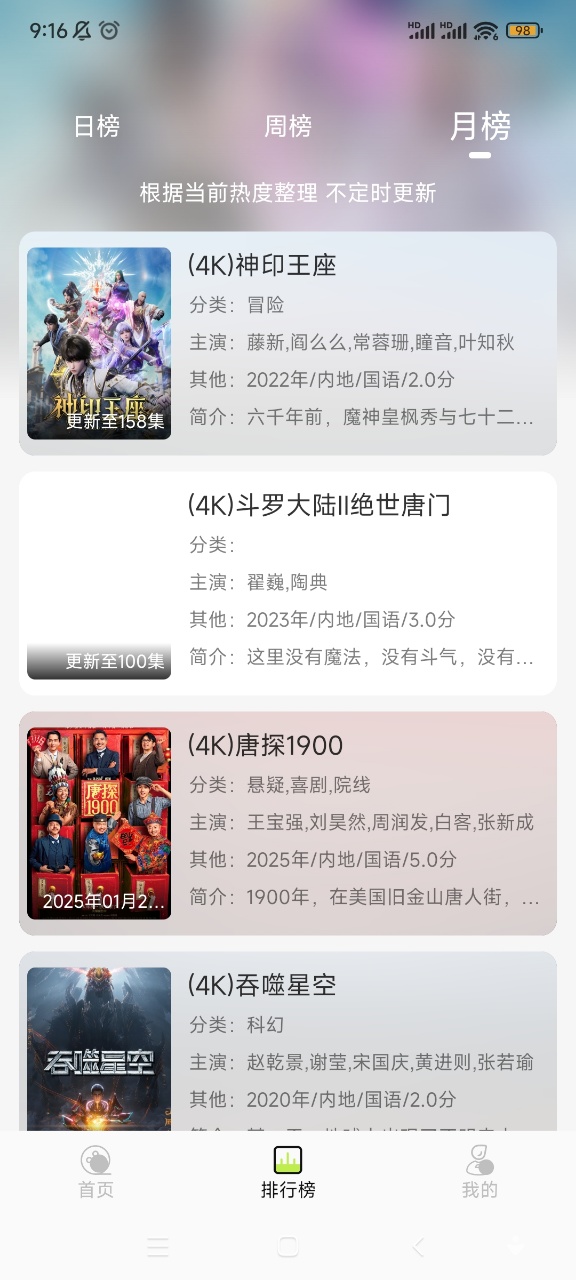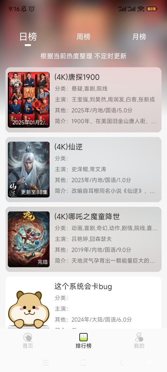 仓鼠4K提供海量免费4K高清影视资源,手机追剧观影更加方便。2025最新更新版本,免费在线追剧,支持屏蔽所有广告,快速搜索进行更新,提供一体化移动程序,覆盖各个类型的电影电视剧动漫一集综艺,支持投屏、倍速以及下载,欢迎喜欢追剧的小伙伴们前来下载使用哦!