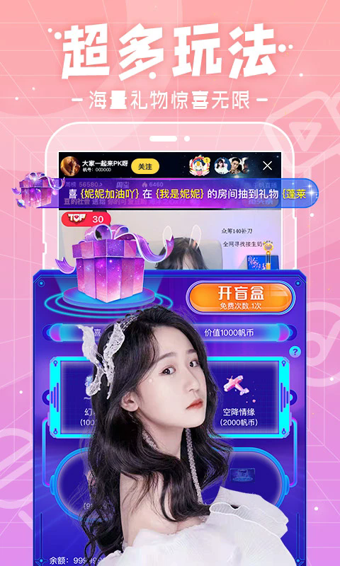 爆灯玩法,开启酷炫特效,帮主播登上全站头条;连麦pk互动玩法升级,各类才艺精彩纷呈,让你放开了玩!
