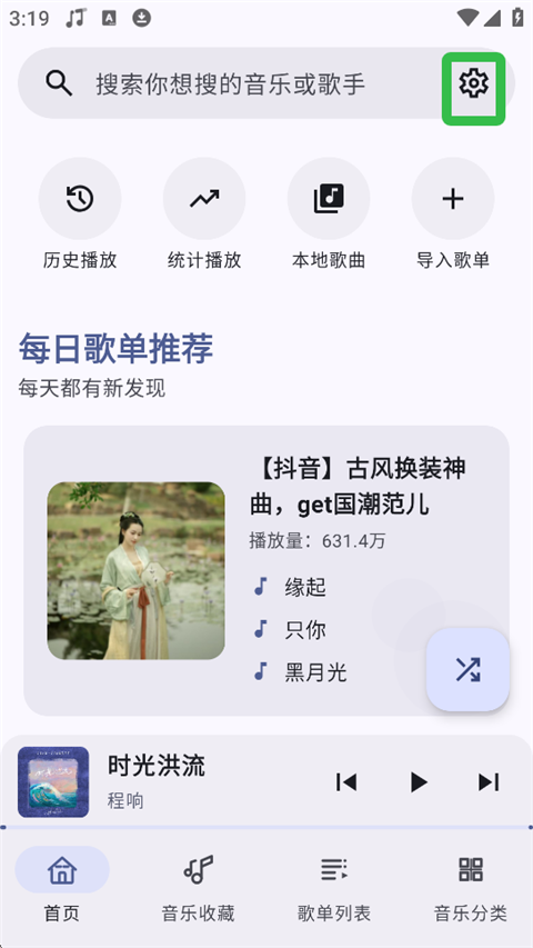 1、在本站内下载安装并打开软件,在软件首页可查看每日推荐歌单、热门榜单,点击歌曲即可在线播放,支持切换音质。