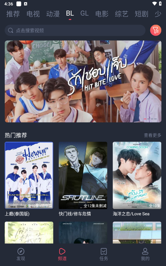 1、在“频道”页面的搜索框中,搜索自己想看的剧或者电影、动漫;