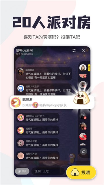 2、唱鸭房间全新升级,20人派对房可升级为50人,实现多人在线互动。