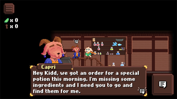 药剂师学徒是一款由E工作室制作发行的冒险休闲益智类游戏。该游戏采用了复古的经典像素风格制作,在这里玩家将化身成为在一家药水店中勤劳又可爱的小学徒山羊“基德”。每当药水店里的草药快用完时师傅都会安排你前往山中采集草药,而年事已高的师傅则留在店内照看。玩家需要操控小基德在山上冒险采集草药最终回到店内。