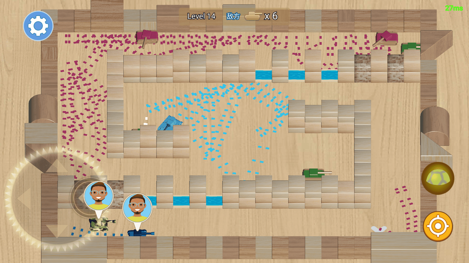 2、左边是控制区,可以360度控制玩家坦克的移动,右边点击按钮可以布雷,点击屏幕发射炮弹